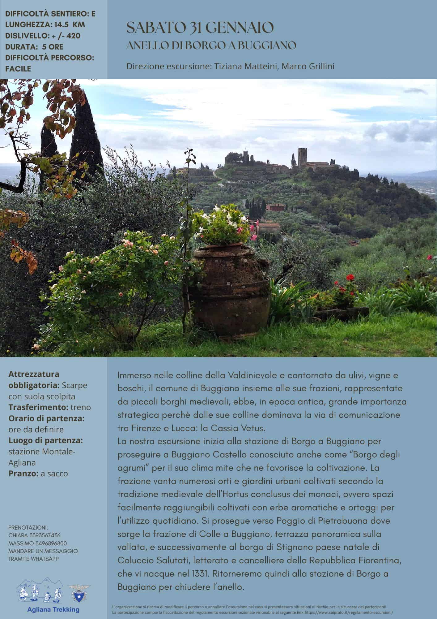 La nostra escursione inizia alla stazione di Borgo a Buggiano per proseguire a Buggiano Castello conosciuto anche come “Borgo degli agrumi” per il suo clima mite che ne favorisce la coltivazione. La frazione vanta numerosi orti e giardini urbani coltivati secondo la tradizione medievale dell’Hortus conclusus dei monaci, ovvero spazi facilmente raggiungibili coltivati con erbe aromatiche e ortaggi per l’utilizzo quotidiano. Si prosegue verso Poggio di Pietrabuona dove sorge la frazione di Colle a Buggiano, terrazza panoramica sulla vallata, e successivamente al borgo di Stignano paese natale di Coluccio Salutati, letterato e cancelliere della Repubblica Fiorentina, che vi nacque nel 1331. Ritorneremo quindi alla stazione di Borgo a Buggiano per chiudere l’anello.