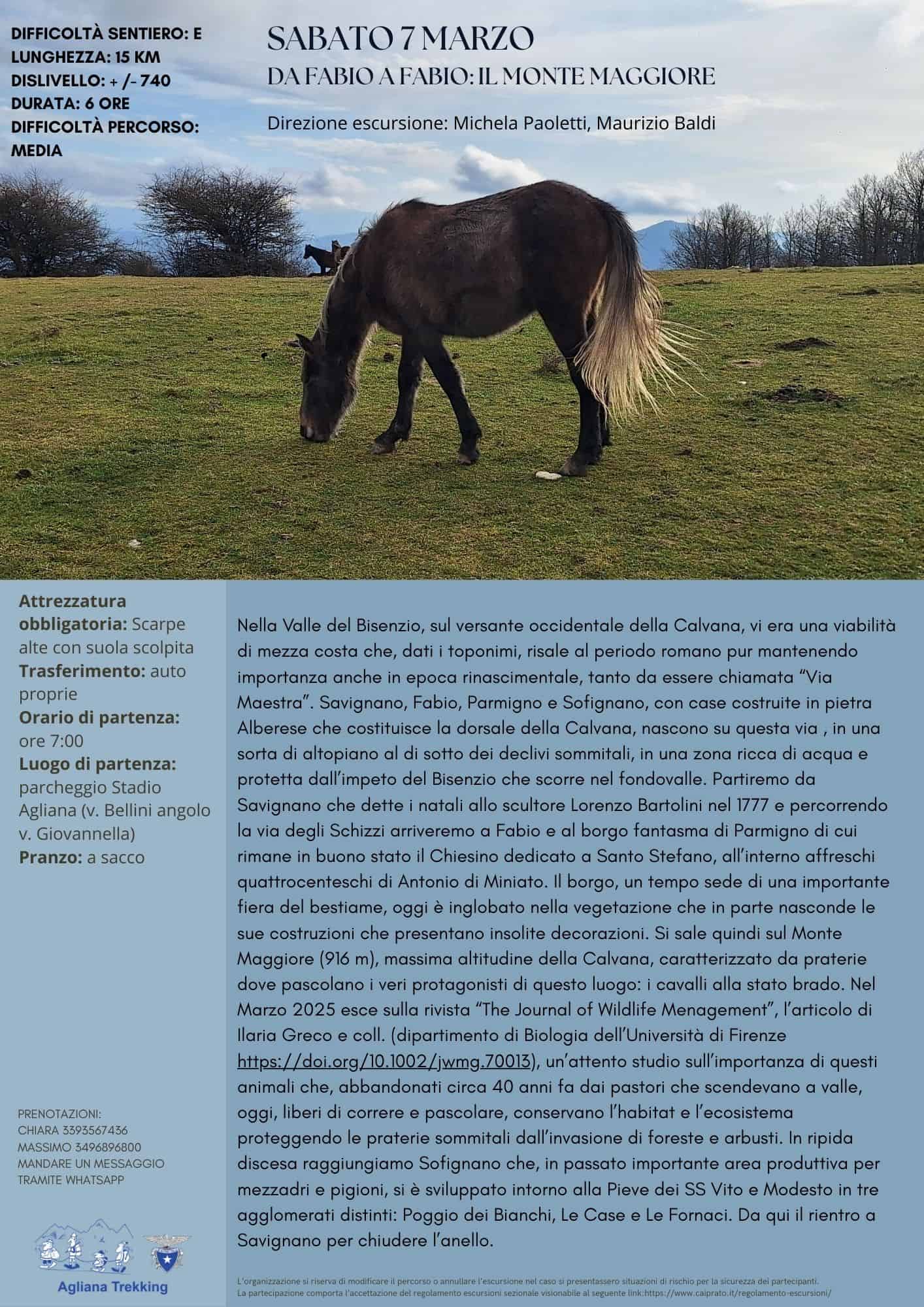 Nella Valle del Bisenzio, sul versante occidentale della Calvana, vi era una viabilità di mezza costa che, dati i toponimi, risale al periodo romano pur mantenendo importanza anche in epoca rinascimentale, tanto da essere chiamata “Via Maestra”. Savignano, Fabio, Parmigno e Sofignano, con case costruite in pietra Alberese che costituisce la dorsale della Calvana, nascono su questa via , in una sorta di altopiano al di sotto dei declivi sommitali, in una zona ricca di acqua e protetta dall’impeto del Bisenzio che scorre nel fondovalle. Partiremo da Savignano che dette i natali allo scultore Lorenzo Bartolini nel 1777 e percorrendo la via degli Schizzi arriveremo a Fabio e al borgo fantasma di Parmigno di cui rimane in buono stato il Chiesino dedicato a Santo Stefano, all’interno affreschi quattrocenteschi di Antonio di Miniato. Il borgo, un tempo sede di una importante fiera del bestiame, oggi è inglobato nella vegetazione che in parte nasconde le sue costruzioni che presentano insolite decorazioni. Si sale quindi sul Monte Maggiore (916 m), massima altitudine della Calvana, caratterizzato da praterie dove pascolano i veri protagonisti di questo luogo: i cavalli alla stato brado. Nel Marzo 2025 esce sulla rivista “The Journal of Wildlife Menagement”, l’articolo di Ilaria Greco e coll. (dipartimento di Biologia dell’Università di Firenze https://doi.org/10.1002/jwmg.70013), un’attento studio sull’importanza di questi animali che, abbandonati circa 40 anni fa dai pastori che scendevano a valle, oggi, liberi di correre e pascolare, conservano l’habitat e l’ecosistema proteggendo le praterie sommitali dall’invasione di foreste e arbusti. In ripida discesa raggiungiamo Sofignano che, in passato importante area produttiva per mezzadri e pigioni, si è sviluppato intorno alla Pieve dei SS Vito e Modesto in tre agglomerati distinti: Poggio dei Bianchi, Le Case e Le Fornaci. Da qui il rientro a Savignano per chiudere l’anello.
