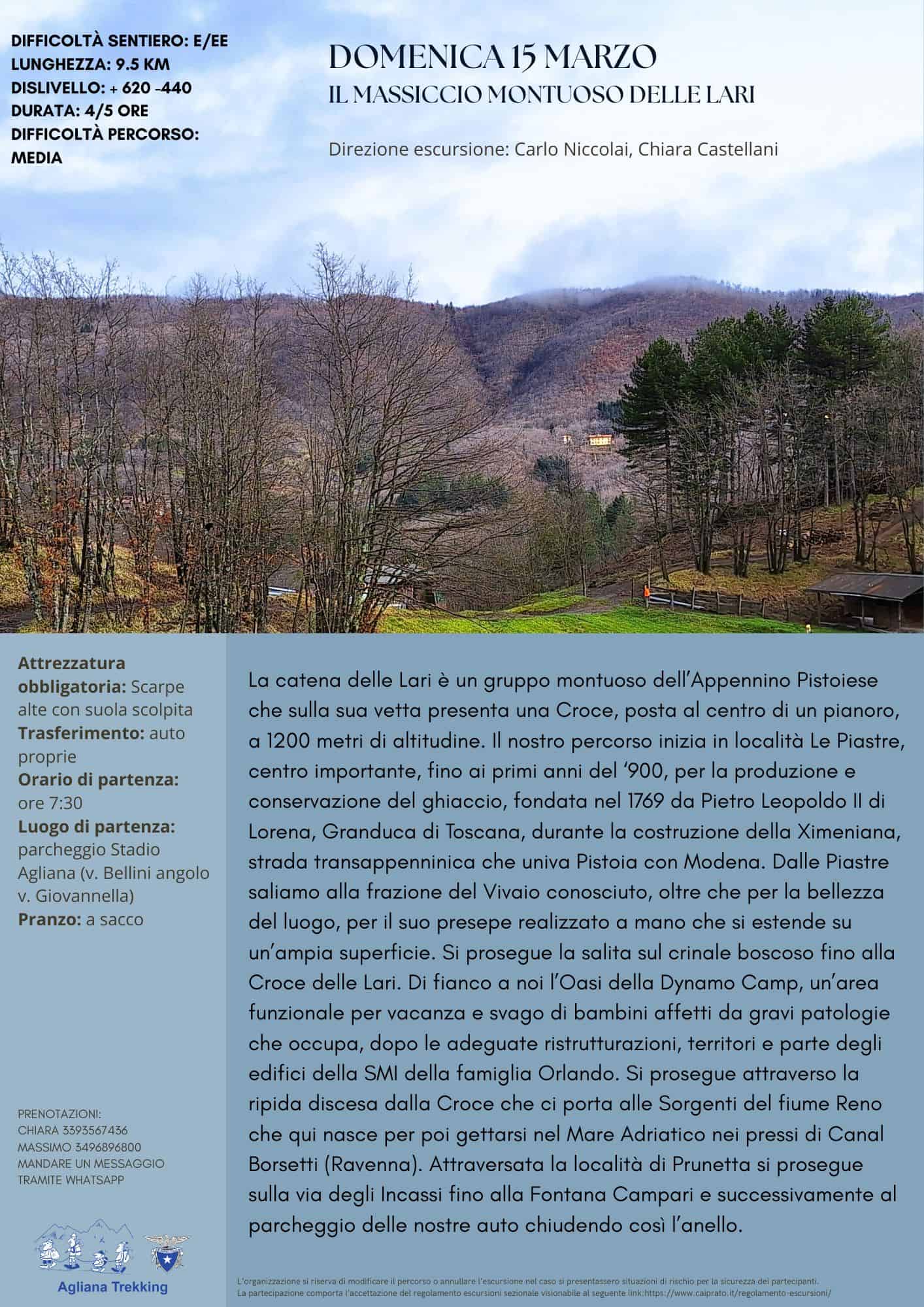 La catena delle Lari è un gruppo montuoso dell’Appennino Pistoiese che sulla sua vetta presenta una Croce, posta al centro di un pianoro, a 1200 metri di altitudine. Il nostro percorso inizia in località Le Piastre, centro importante, fino ai primi anni del ‘900, per la produzione e conservazione del ghiaccio, fondata nel 1769 da Pietro Leopoldo II di Lorena, Granduca di Toscana, durante la costruzione della Ximeniana, strada transappenninica che univa Pistoia con Modena. Dalle Piastre saliamo alla frazione del Vivaio conosciuto, oltre che per la bellezza del luogo, per il suo presepe realizzato a mano che si estende su un’ampia superficie. Si prosegue la salita sul crinale boscoso fino alla Croce delle Lari. Di fianco a noi l’Oasi della Dynamo Camp, un’area funzionale per vacanza e svago di bambini affetti da gravi patologie che occupa, dopo le adeguate ristrutturazioni, territori e parte degli edifici della SMI della famiglia Orlando. Si prosegue attraverso la ripida discesa dalla Croce che ci porta alle Sorgenti del fiume Reno che qui nasce per poi gettarsi nel Mare Adriatico nei pressi di Canal Borsetti (Ravenna). Attraversata la località di Prunetta si prosegue sulla via degli Incassi fino alla Fontana Campari e successivamente al parcheggio delle nostre auto chiudendo così l’anello.