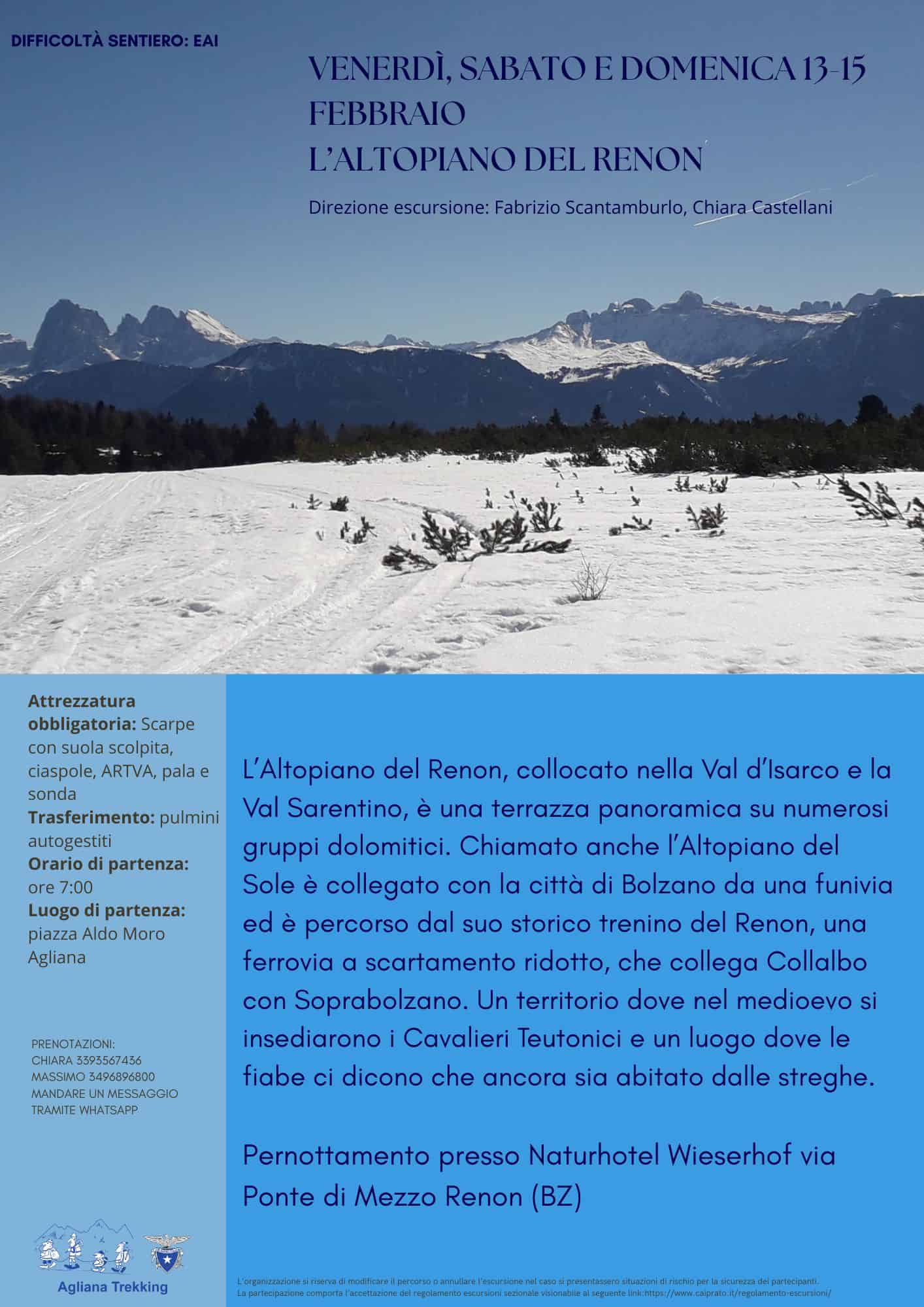 Difficoltà sentiero: EAI Attrezzatura obbligatoria: Scarpe con suola scolpita, ciaspole, ARTVA, pala e sonda. Trasferimento: pulmini autogestiti. Orario di partenza: ore 7:00. Luogo di partenza: piazza Aldo Moro Agliana.