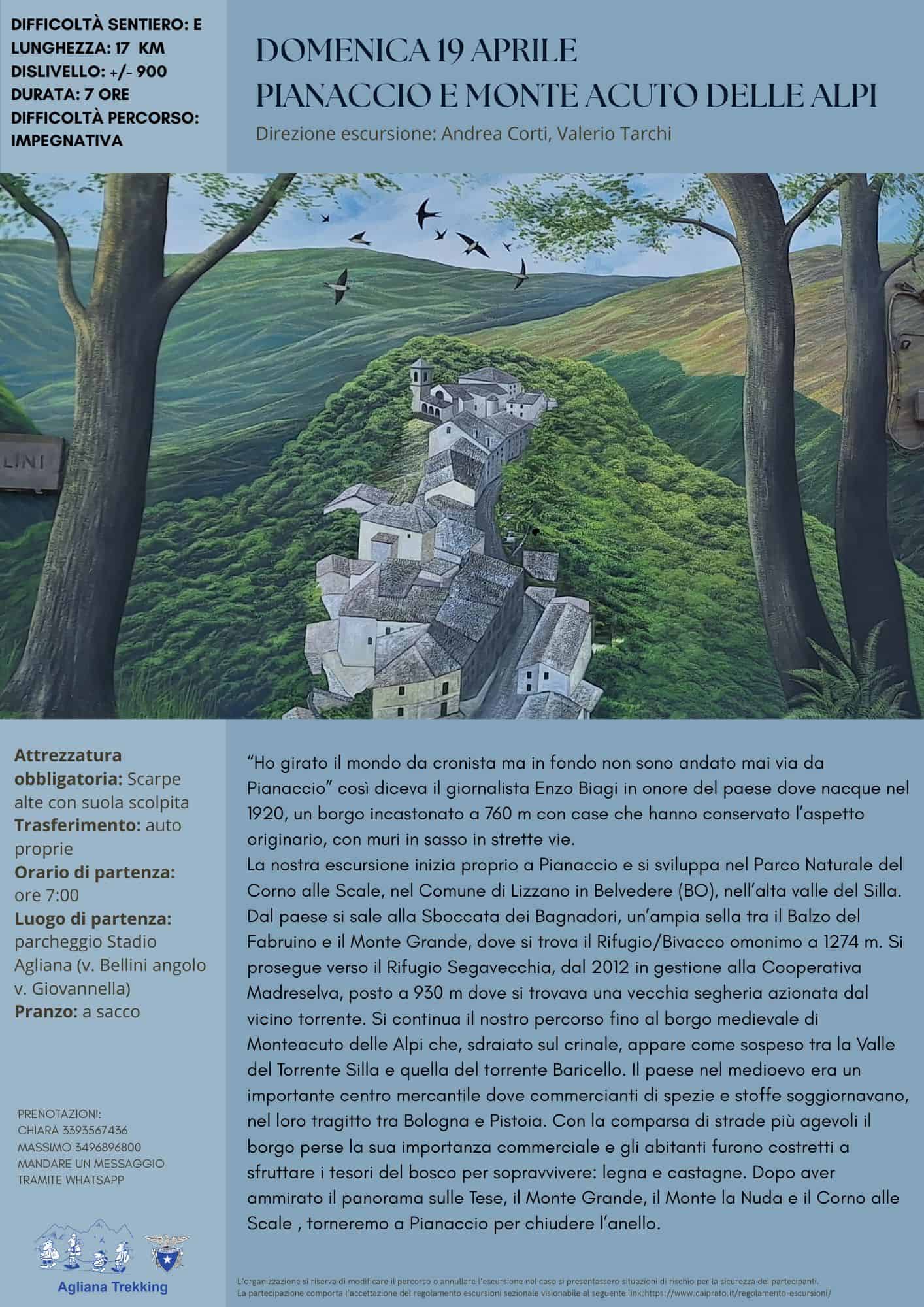 “Ho girato il mondo da cronista ma in fondo non sono andato mai via da Pianaccio” così diceva il giornalista Enzo Biagi in onore del paese dove nacque nel 1920, un borgo incastonato a 760 m con case che hanno conservato l’aspetto originario, con muri in sasso in strette vie. La nostra escursione inizia proprio a Pianaccio e si sviluppa nel Parco Naturale del Corno alle Scale, nel Comune di Lizzano in Belvedere (BO), nell’alta valle del Silla. Dal paese si sale alla Sboccata dei Bagnadori, un’ampia sella tra il Balzo del Fabruino e il Monte Grande, dove si trova il Rifugio/Bivacco omonimo a 1274 m. Si prosegue verso il Rifugio Segavecchia, dal 2012 in gestione alla Cooperativa Madreselva, posto a 930 m dove si trovava una vecchia segheria azionata dal vicino torrente. Si continua il nostro percorso fino al borgo medievale di Monteacuto delle Alpi che, sdraiato sul crinale, appare come sospeso tra la Valle del Torrente Silla e quella del torrente Baricello. Il paese nel medioevo era un importante centro mercantile dove commercianti di spezie e stoffe soggiornavano, nel loro tragitto tra Bologna e Pistoia. Con la comparsa di strade più agevoli il borgo perse la sua importanza commerciale e gli abitanti furono costretti a sfruttare i tesori del bosco per sopravvivere: legna e castagne. Dopo aver ammirato il panorama sulle Tese, il Monte Grande, il Monte la Nuda e il Corno alle Scale , torneremo a Pianaccio per chiudere l’anello.