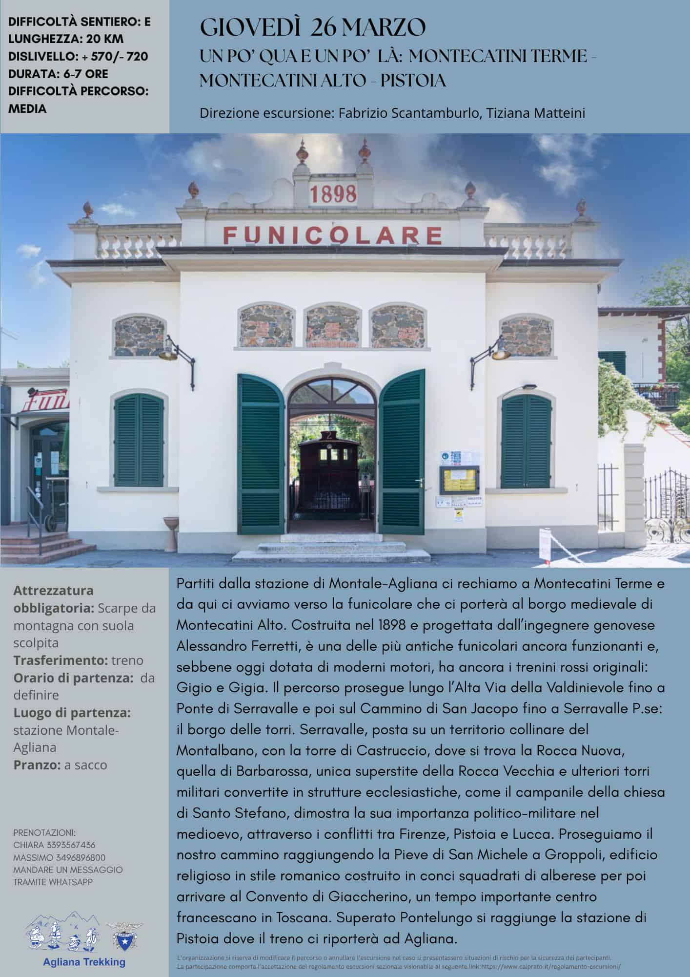 Partiti dalla stazione di Montale-Agliana ci rechiamo a Montecatini Terme e da qui ci avviamo verso la funicolare che ci porterà al borgo medievale di Montecatini Alto. Costruita nel 1898 e progettata dall’ingegnere genovese Alessandro Ferretti, è una delle più antiche funicolari ancora funzionanti e, sebbene oggi dotata di moderni motori, ha ancora i trenini rossi originali: Gigio e Gigia. Il percorso prosegue lungo l’Alta Via della Valdinievole fino a Ponte di Serravalle e poi sul Cammino di San Jacopo fino a Serravalle P.se: il borgo delle torri. Serravalle, posta su un territorio collinare del Montalbano, con la torre di Castruccio, dove si trova la Rocca Nuova, quella di Barbarossa, unica superstite della Rocca Vecchia e ulteriori torri militari convertite in strutture ecclesiastiche, come il campanile della chiesa di Santo Stefano, dimostra la sua importanza politico-militare nel medioevo, attraverso i conflitti tra Firenze, Pistoia e Lucca. Proseguiamo il nostro cammino raggiungendo la Pieve di San Michele a Groppoli, edificio religioso in stile romanico costruito in conci squadrati di alberese per poi arrivare al Convento di Giaccherino, un tempo importante centro francescano in Toscana. Superato Pontelungo si raggiunge la stazione di Pistoia dove il treno ci riporterà ad Agliana.