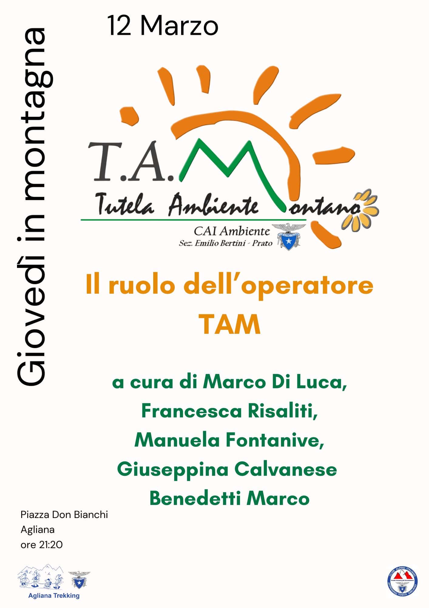 Giovedì 12 marzo parleremo del ruolo dell’operatore TAM (Tutela Ambiente Montano). L’incontro si svolgerà alle ore 21.20 presso la nostra sede in Piazza Don Bianchi ad Agliana.